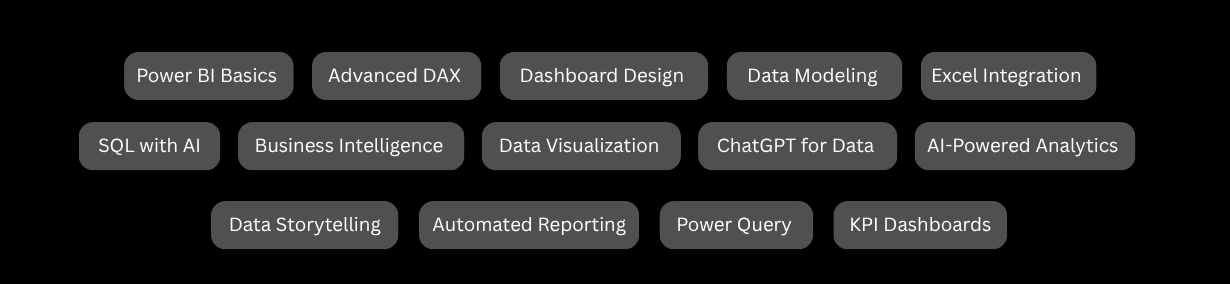 You’ll learn skills companies demand from data cleaning to advanced dashboards with AI. This prepares you for roles like Data Analyst, BI Analyst, and Power BI Developer.